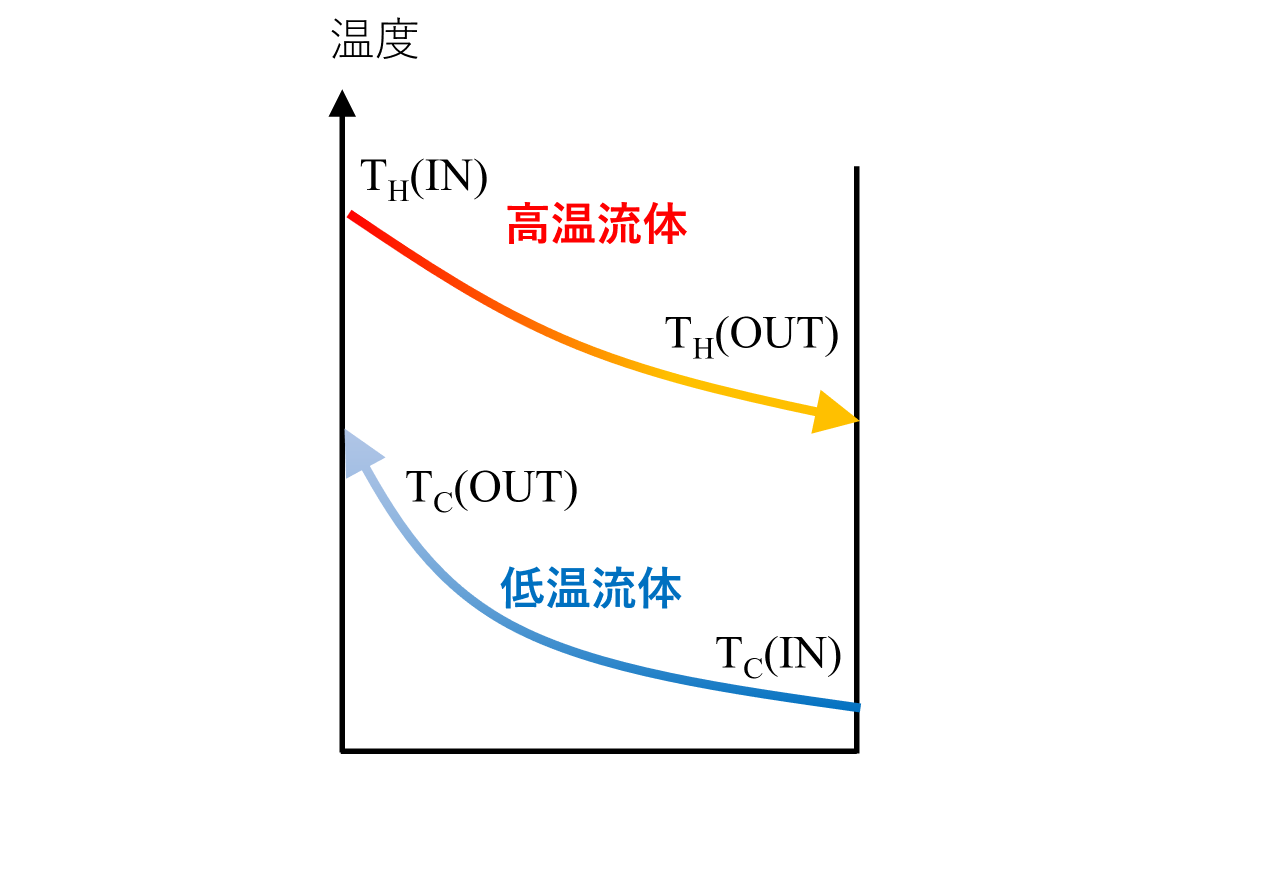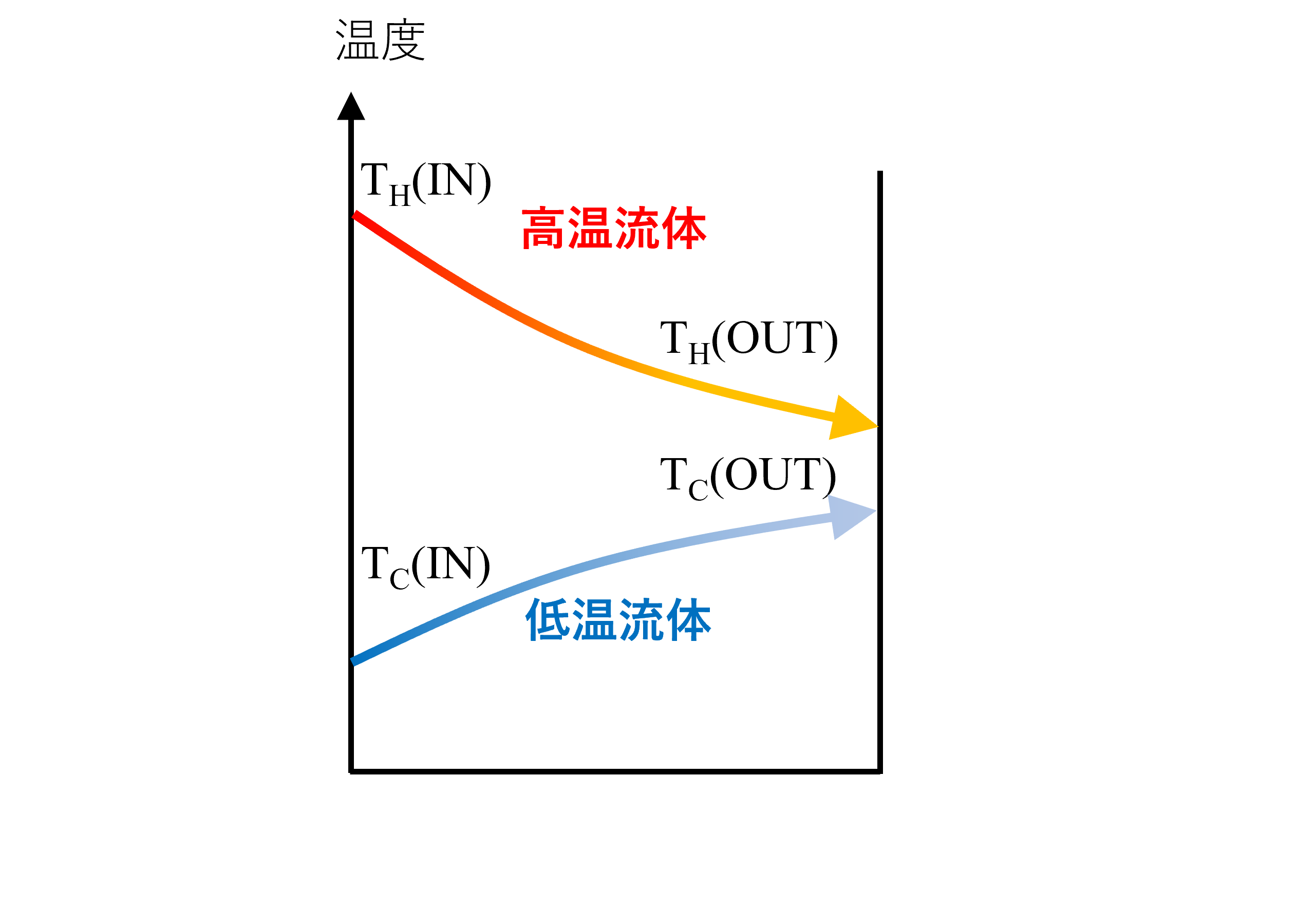 高温流体が入口温度$T_H(入口)$から出口温度$T_H(出口)$まで低下した場合、取り除かれた熱量は$Q=M_HC_H(T_H(入口)-T_H(出口))$と書けます。($M_H$は流量、$C_H$は比熱)